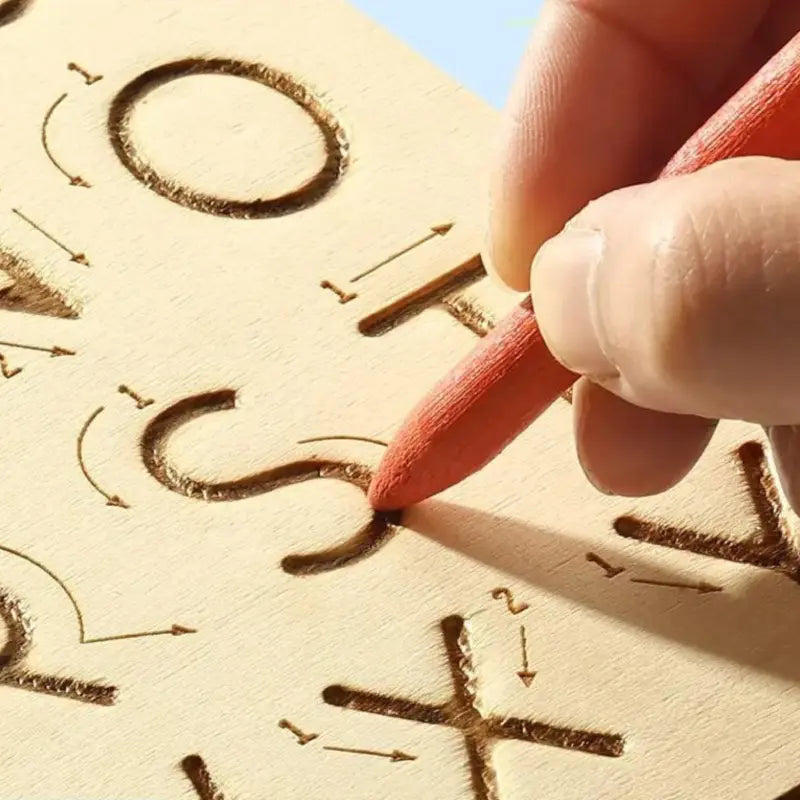 Les lettres sont gravées dans le bois avec des flÚches claires pour guider la main naturellement.